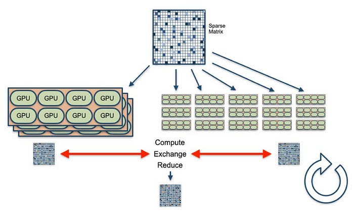 So, how does compute hardware support AI training workflows? In order to find the optimal weights, sparse matrix multiplications are distributed to tens of thousands of GPUs. The GPUs would go through a compute, exchange, and reduce cycle — the GPUs each compute intensively themselves, then synchronize with other GPUs to average and reduce their computations together, and then another cycle starts.
